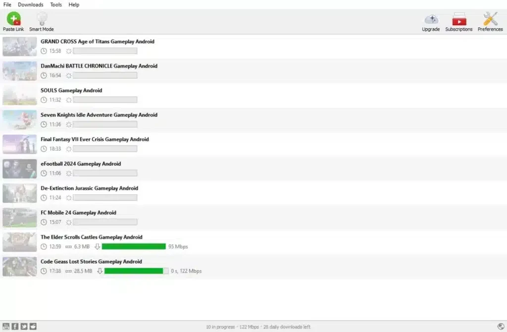 ستجد قائمة شاملة بمنصات التواصل الاجتماعي الداعمة التي يمكنك تنزيل الفيديوهات منها . اشترك في قنواتك أو قوائم التشغيل المفضلة لديك لتنزيل الفيديوهات بسرعة. يمكنك تنزيل الفيديوهات من يوتيوب، وديلي موشن، وتمبلر، وإنستغرام، وفيسبوك، وتويتر، وفيميو ، وغيرها. كما يمكنك تقسيم ملفات الفيديو الكبيرة إلى أجزاء قابلة للتنزيل بسهولة للوصول إلى فيديوهاتك الكبيرة المفضلة.